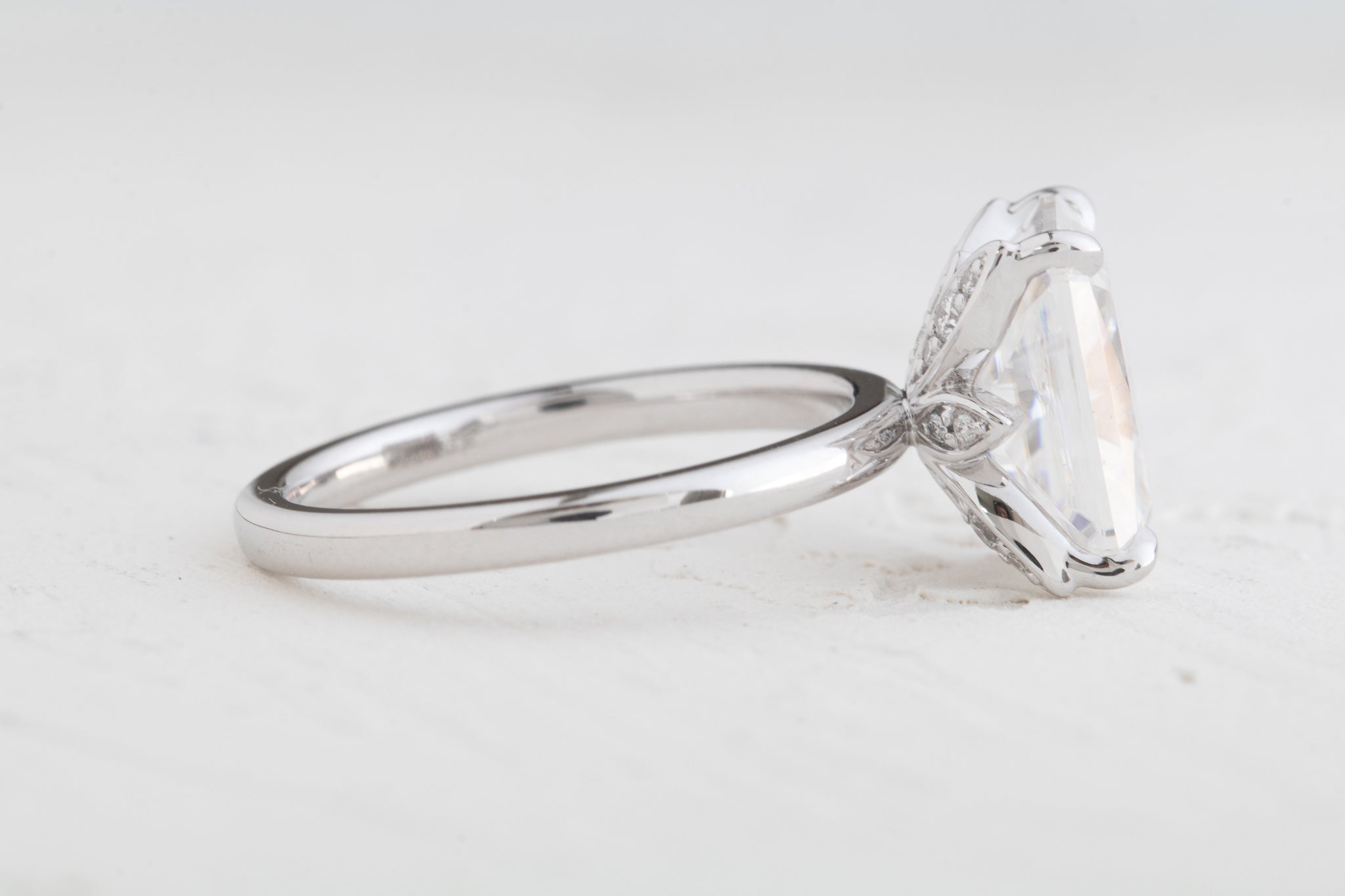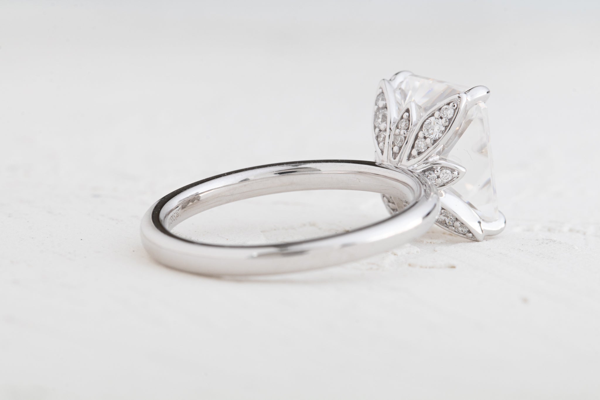 Briar offers a subtle floral elegance that enhances without overpowering. This beautiful solitaire features delicate pave petals visible from the side, adding just the right amount of sparkle. Ideal for those who want a simple solitaire look from the top with sparkles hidden in the profile.