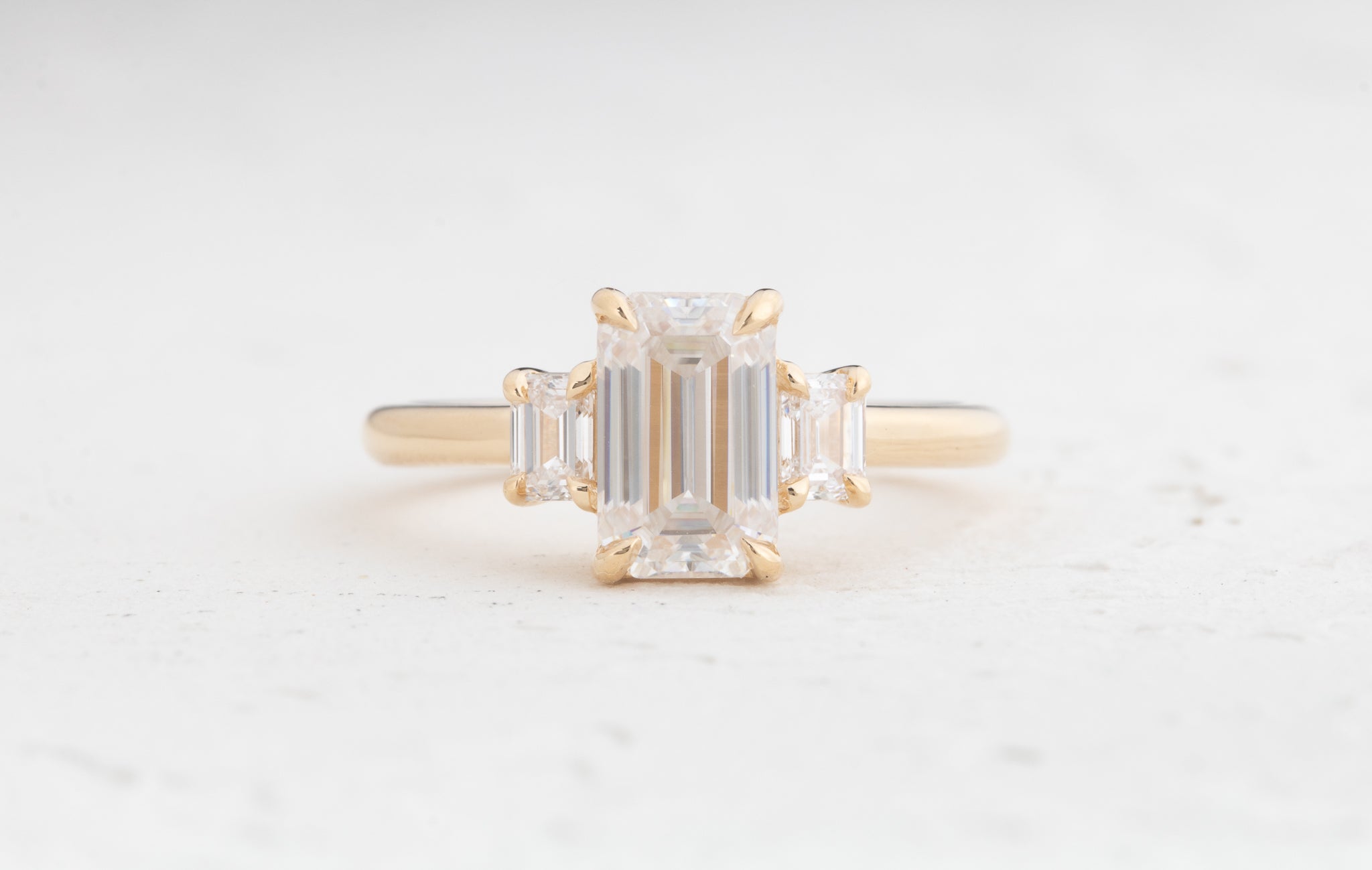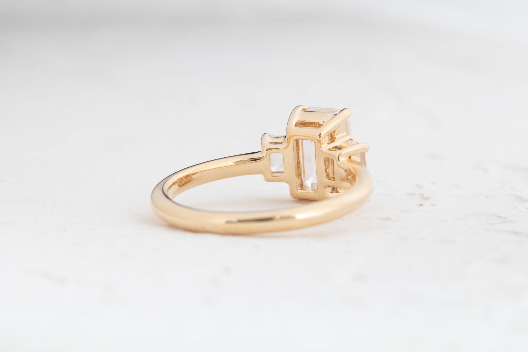 The Constance ring stands out with an edgy design, showcasing a center framed by two emerald cut lab diamonds that are crafted to radiate in every direction. This three stone beauty is perfect for the modern contemporary bride.