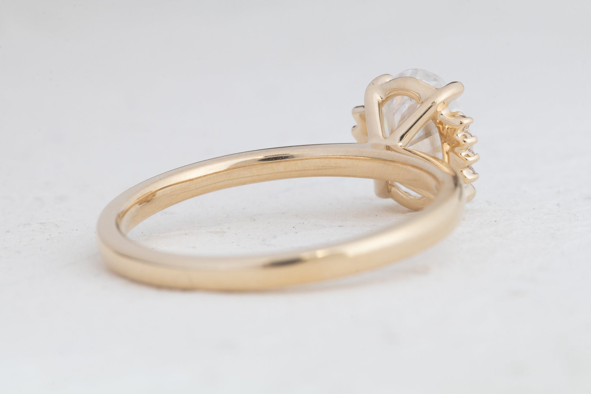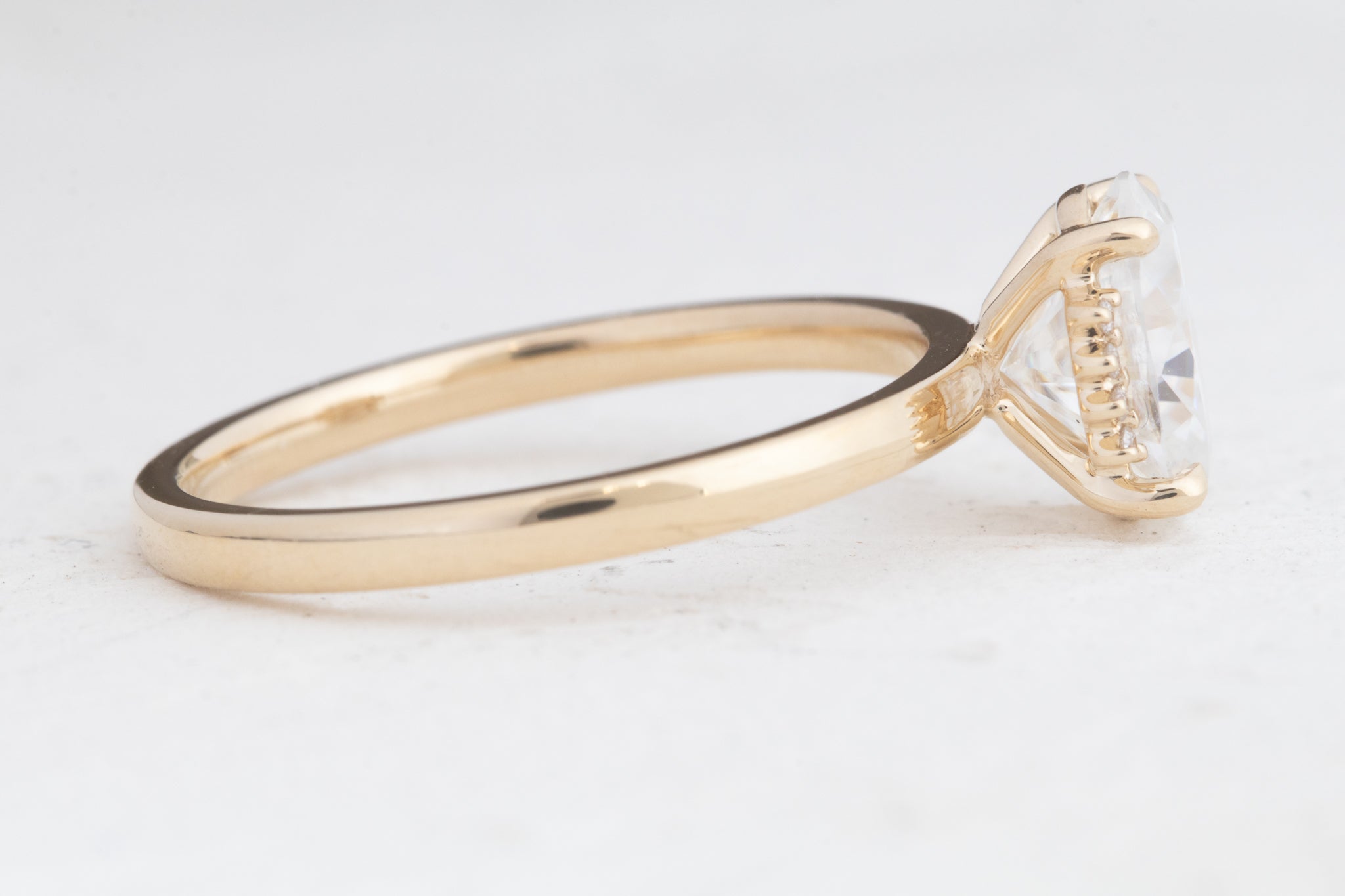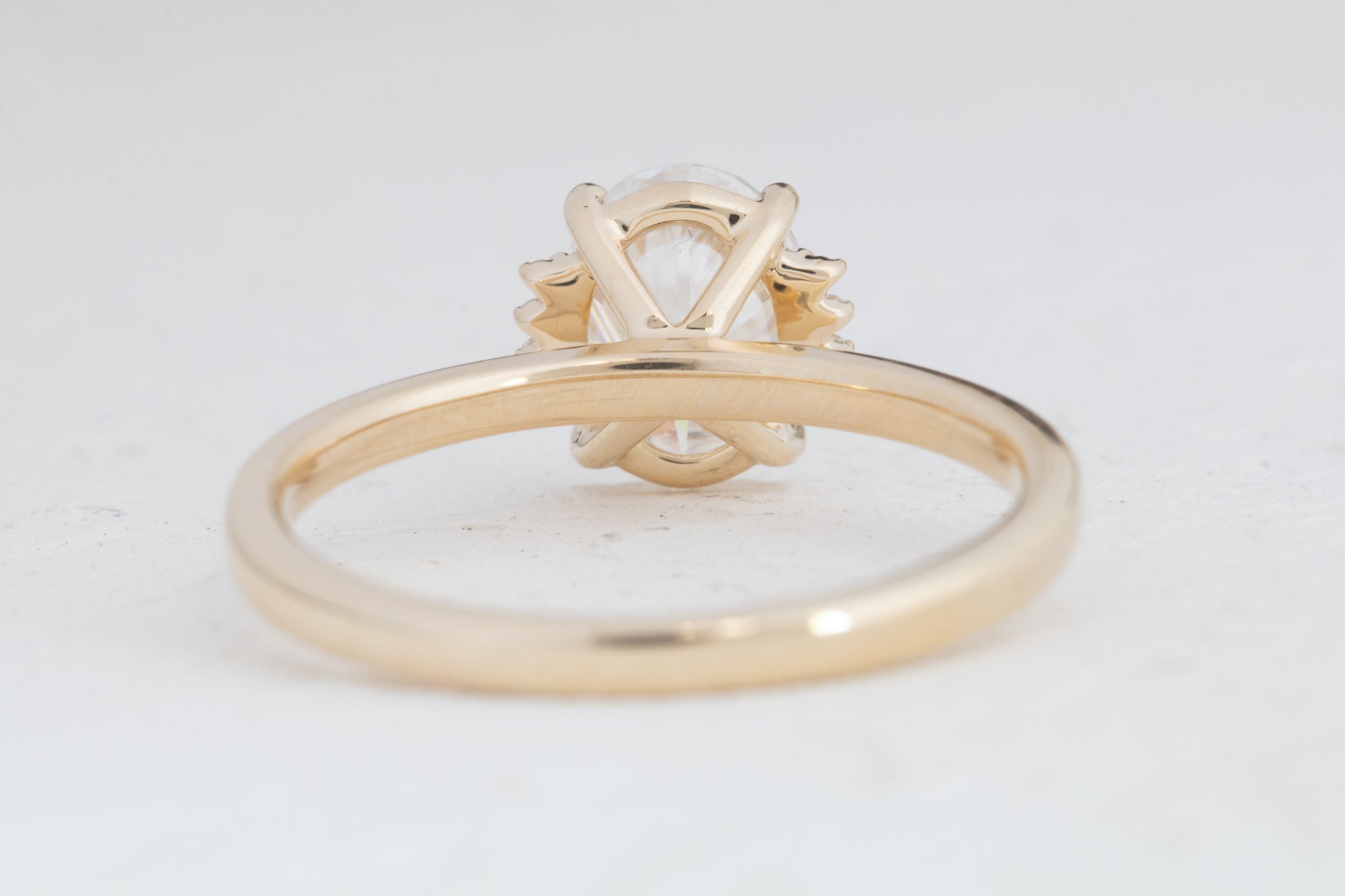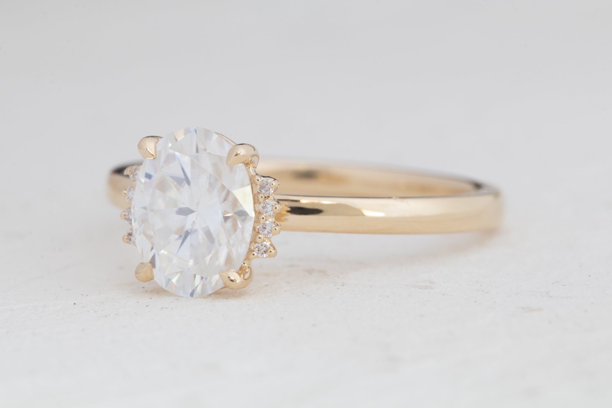 • Shown with a 2ct oval moissanite set in 14K yellow gold with a 2mm band.