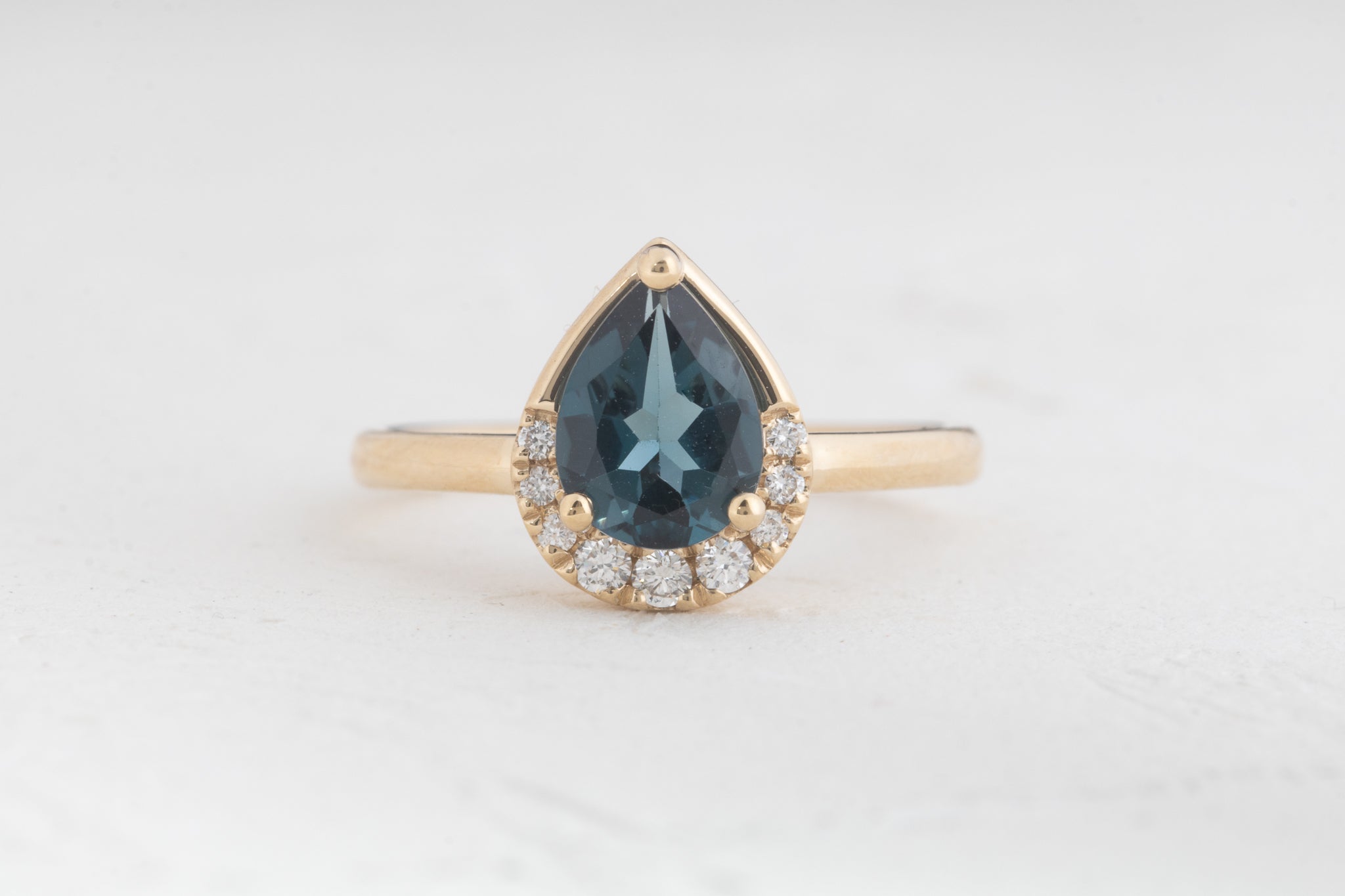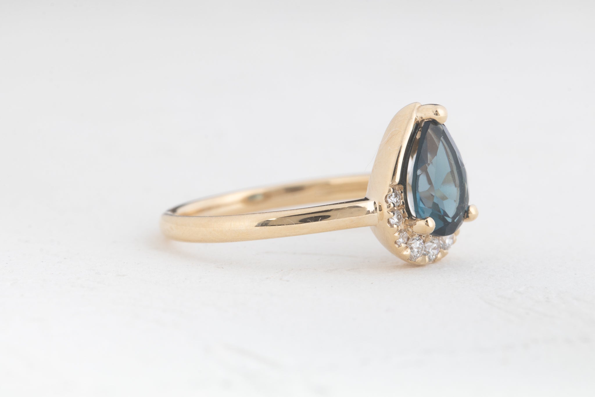 London features a deep blue topaz with brilliant diamonds set along the stone's lower curve. The combination of blue and white creates a distinctive look for an engagement ring that stands out from traditional designs. The topaz's rich color pairs beautifully with the sparkle of the diamonds, offering a modern alternative for those who prefer colored gemstones.