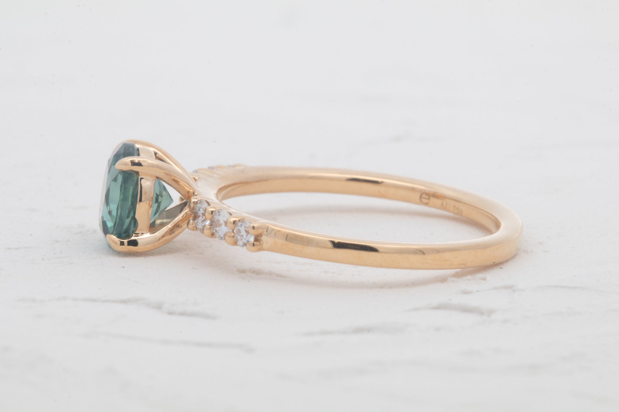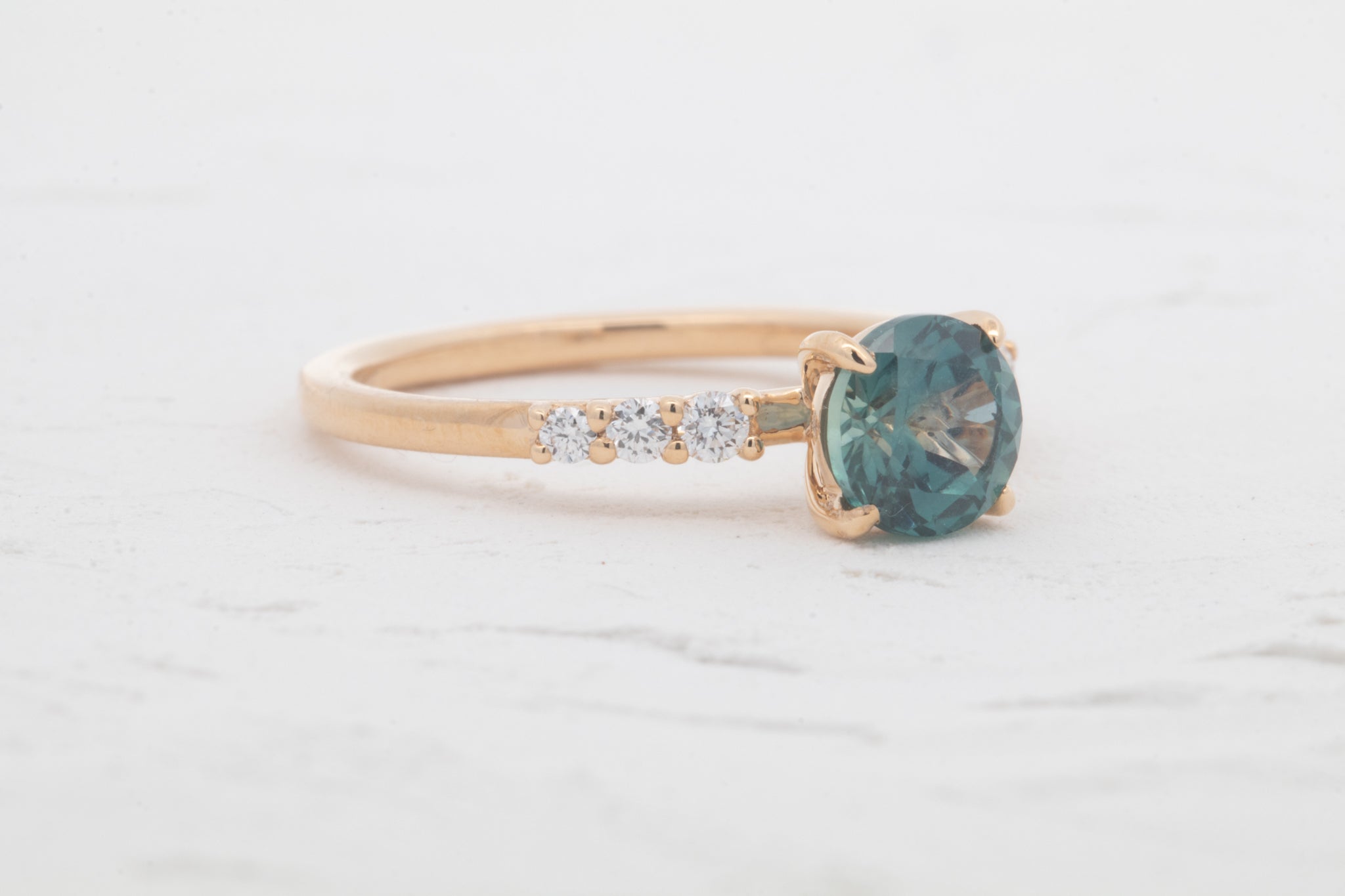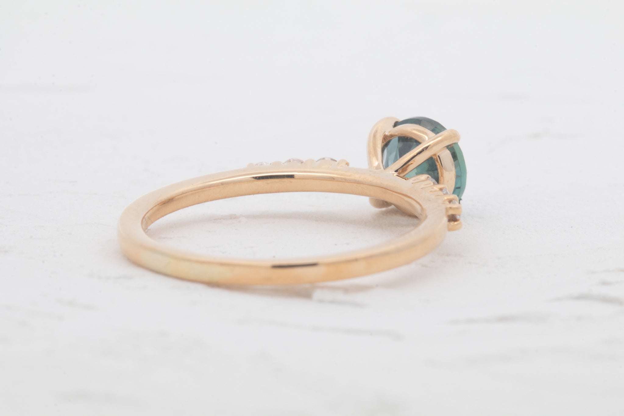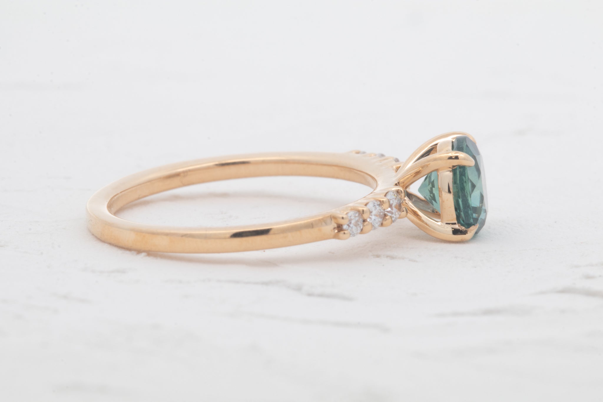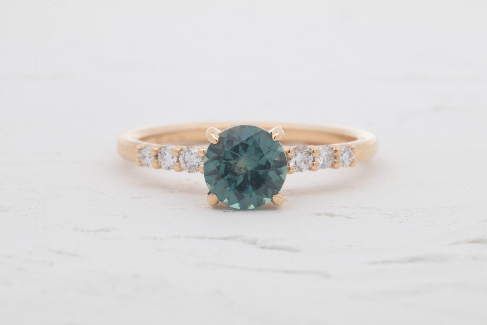 Expertly crafted with a stunning natural Montana teal sapphire, the Maribelle ring radiates elegance. The simple design is elevated by a 3-diamond pave band, subtly increasing in size for a sophisticated touch.