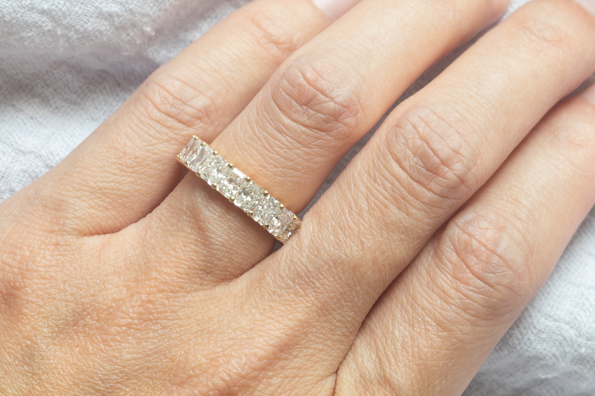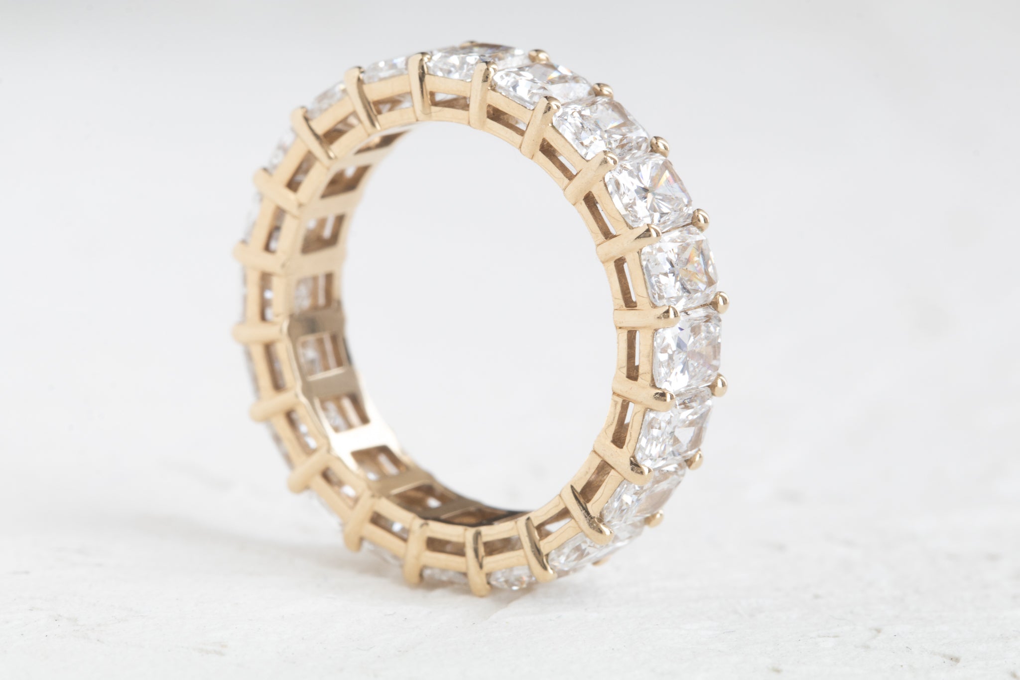 This stunning Radiant Diamond Eternity Ring features larger radiant cut diamonds that create an eye-catching look. It is low profile, making it comfortable to wear. Perfect for any special occasion and able to be worn alone or stacked, this ring is sure to make a statement!