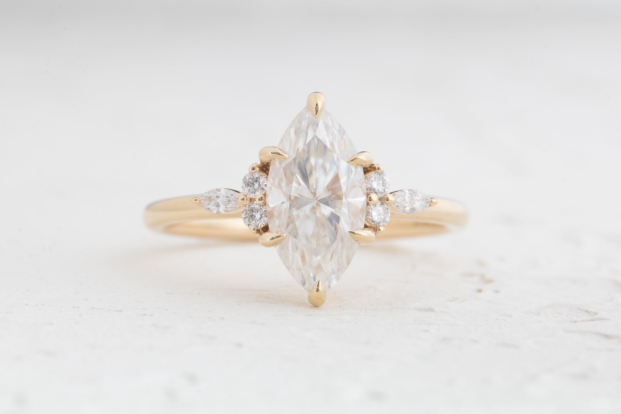 • Shown with a 2ct marquise moissanite in 14k yellow gold.