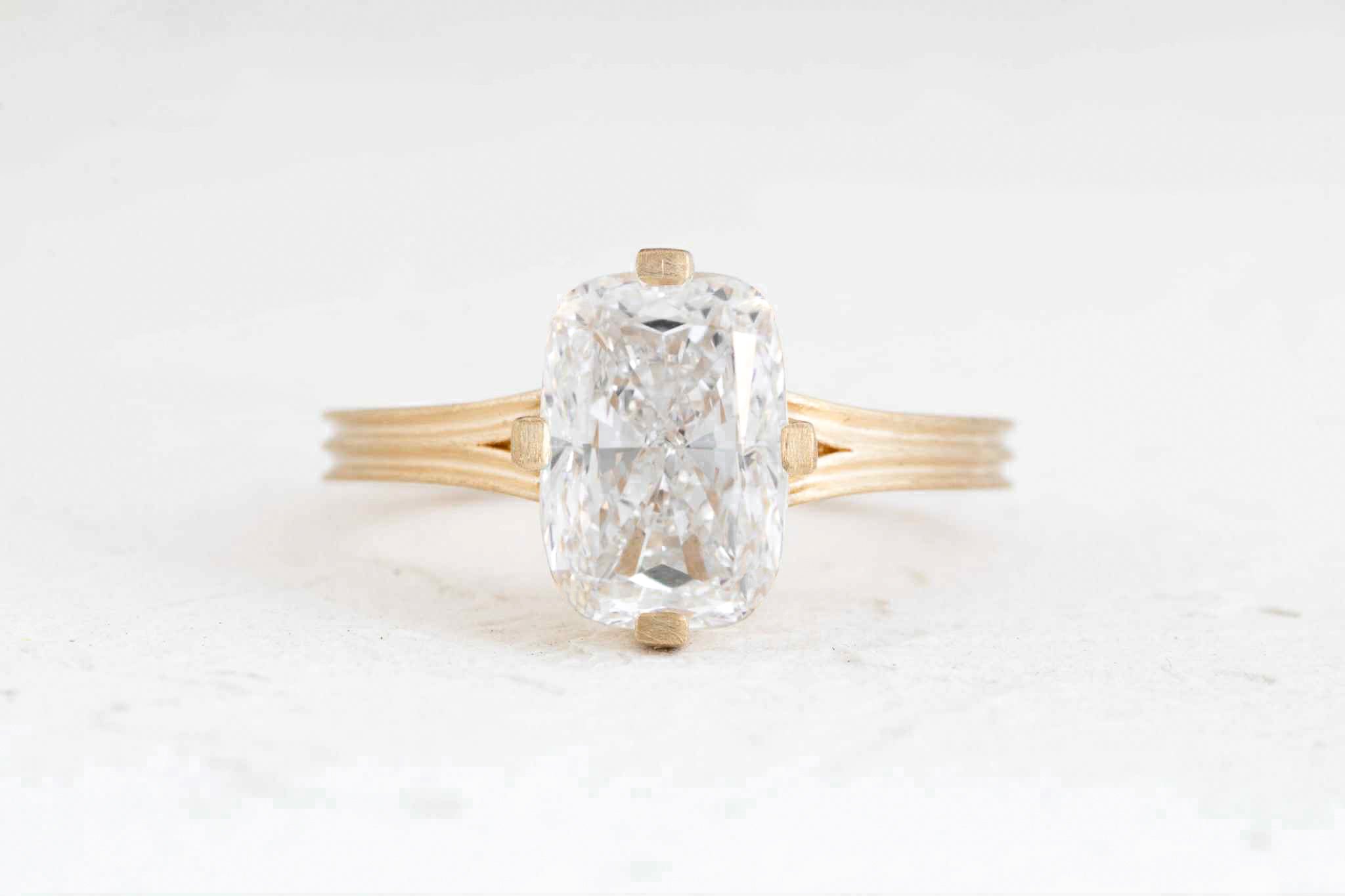 • Shown with 2.5ct cushion lab diamond crafted in a 14k yellow gold, satin finish.