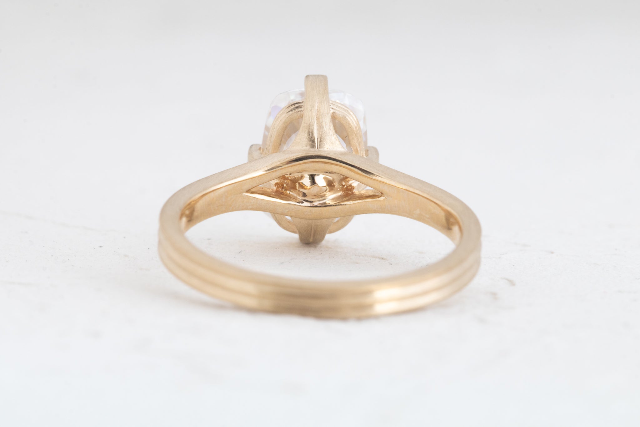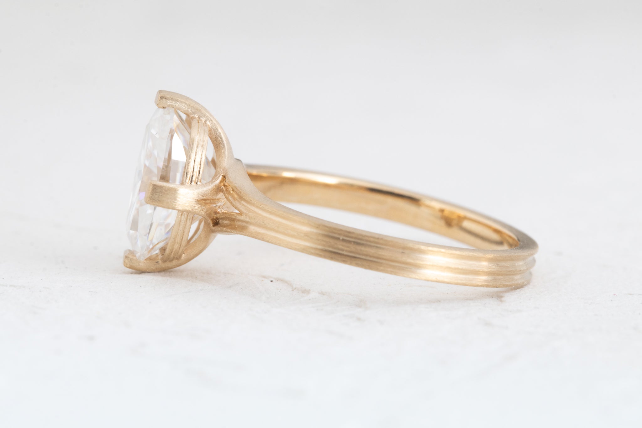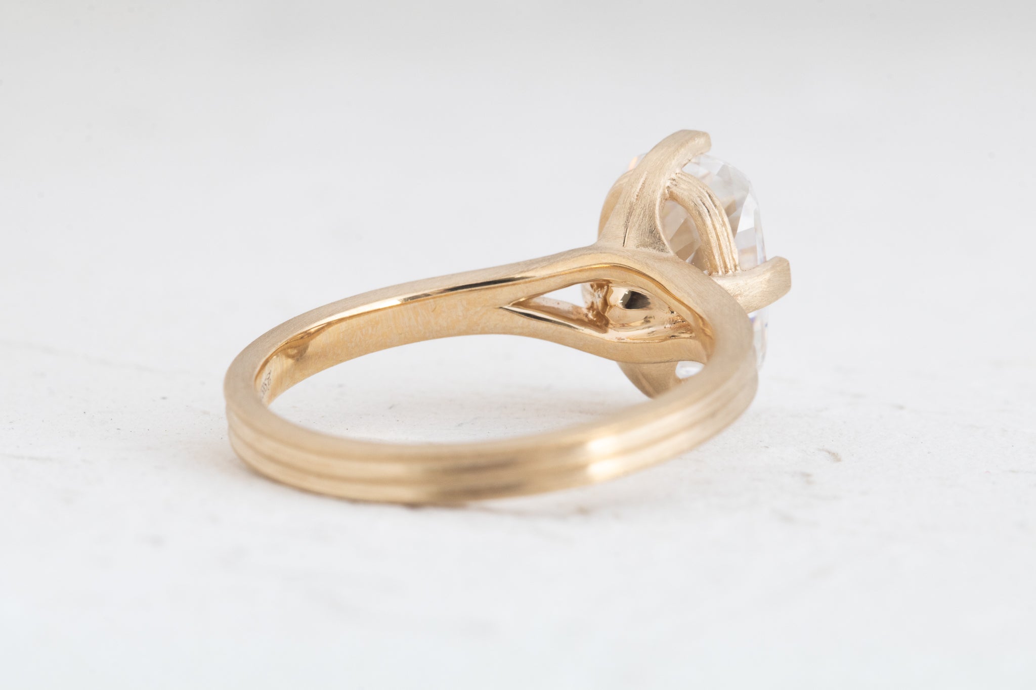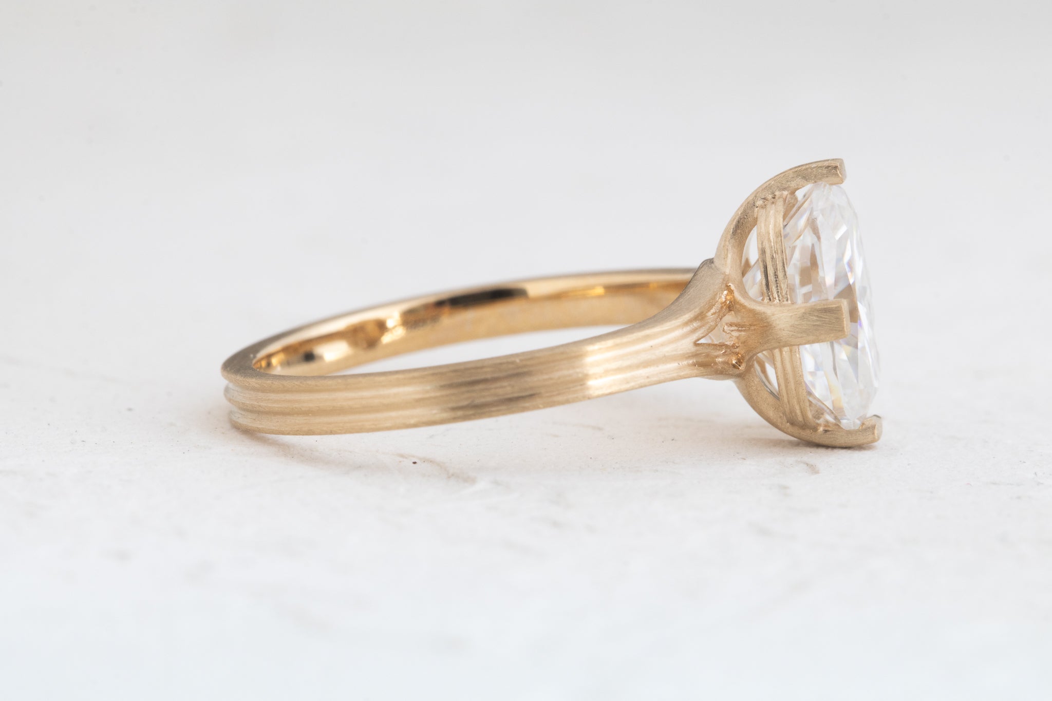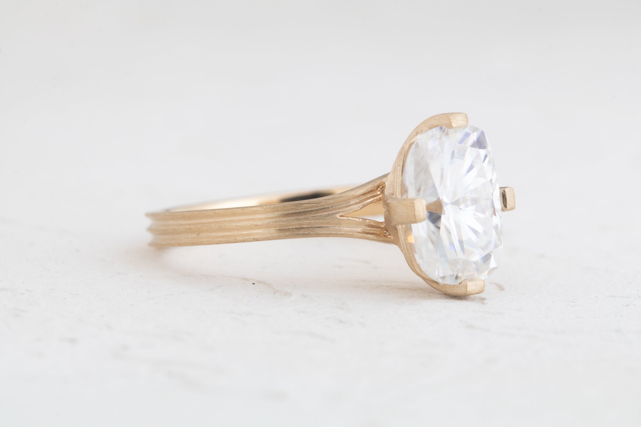Rue is crafted with a distinctive ridged band that elegantly splits near the top, adding intricate texture and depth to this solitaire. This subtle yet impactful design elevates the classic solitaire with a modern architectural touch.